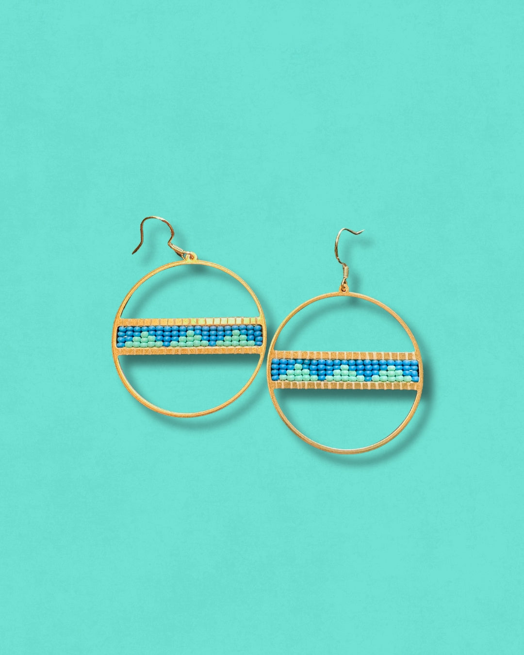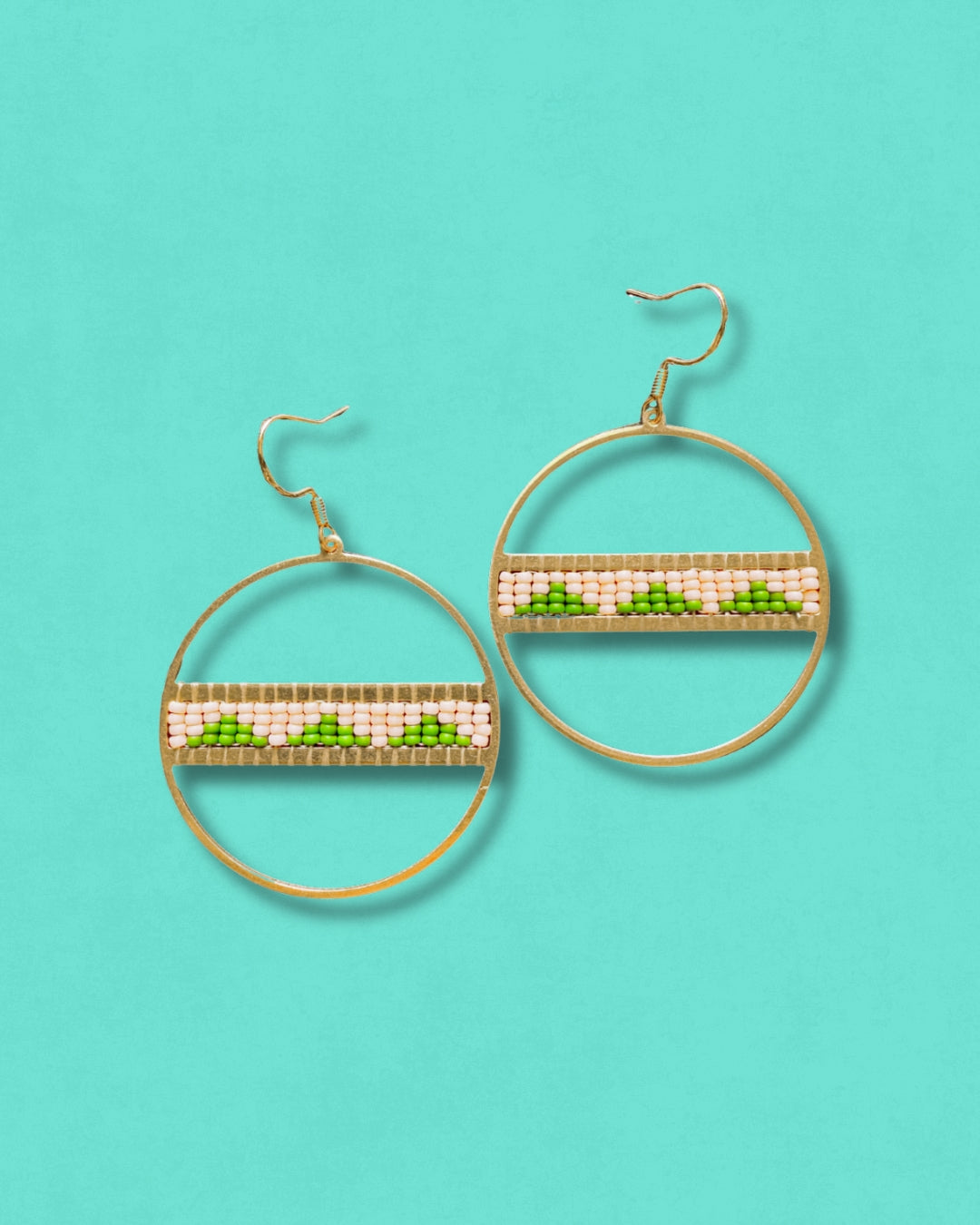 Soft tones of light pink and sage green, sea glass and navy blue, goldenrod and navy blue come together in this design—grounded like the land, gentle like the sky at dusk.