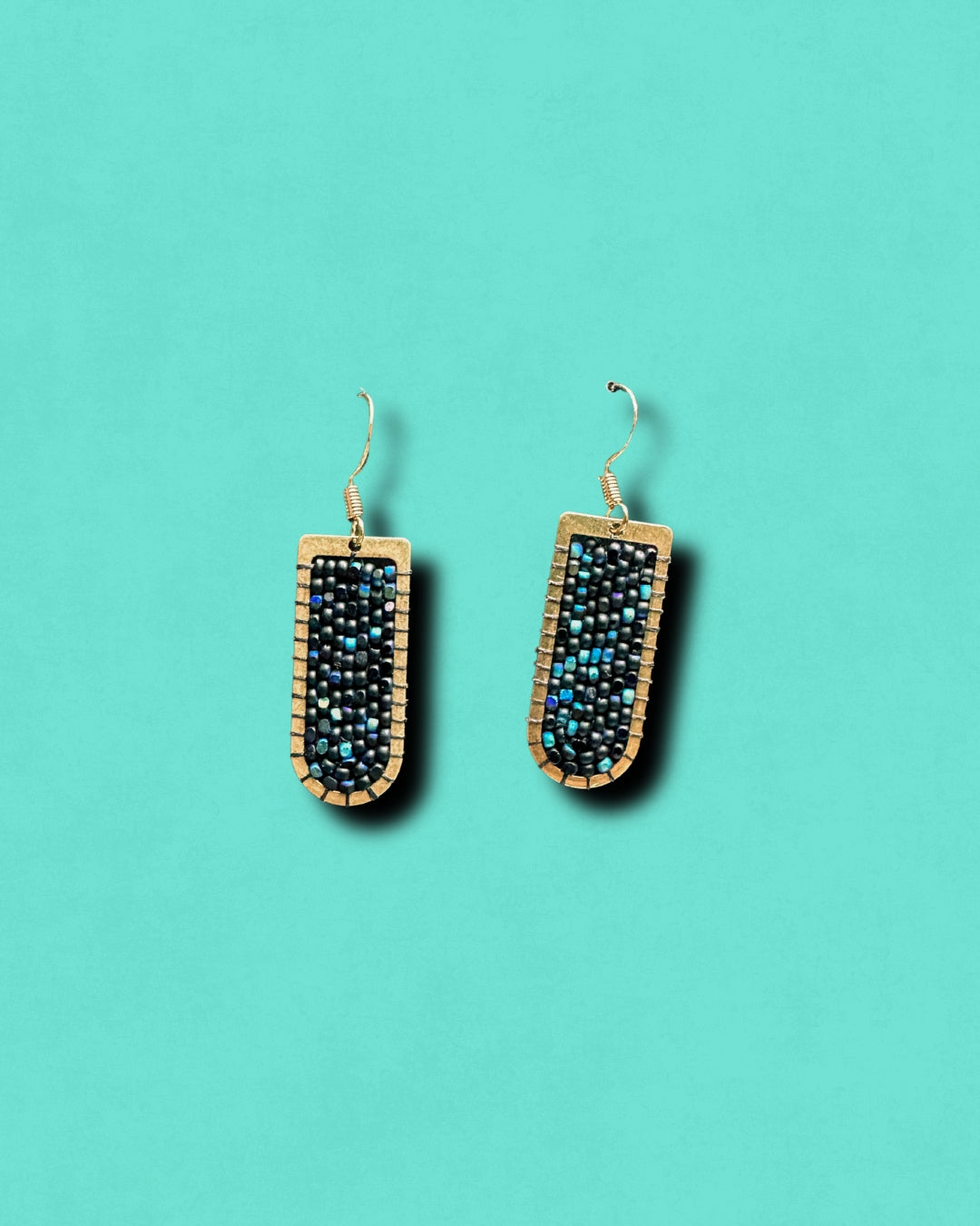 This pair carries a depth of stone and shadow. Dark crystal shades of blue, purple, green and gold that shimmer like the light catching the inside of a geode. Multi-color cut glass beads bring texture and movement, while the U-frame shape holds it all together with quiet strength.